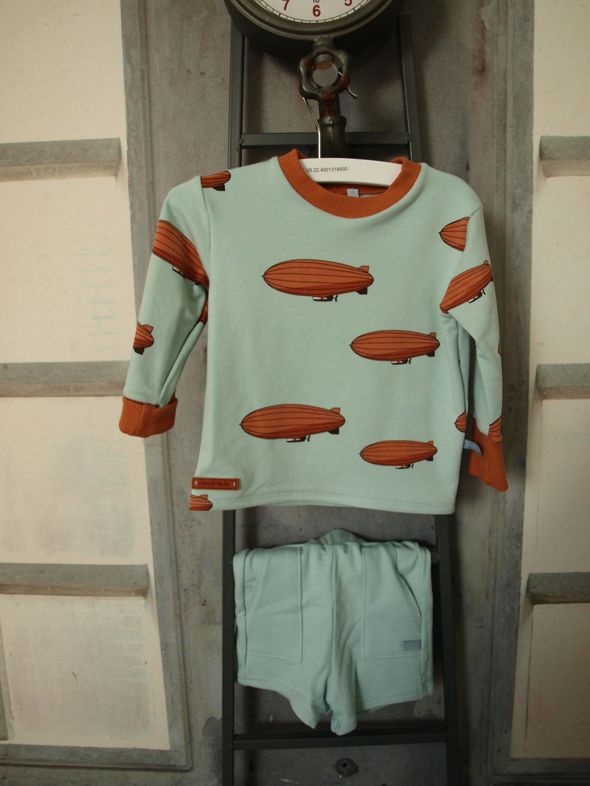 Maak je klaar voor een vrolijk avontuur met dit sprankelende pakje in een frisse zeegroen/mint kleur! Het truitje is bedrukt met brique kleurige zeppelins en boordjes die een prachtig contrast vormen met de mooie stof. Het korte broekje komt is voorzien van steekzakken . Het geheel is gemaakt van een heerlijk comfortabele french terry die vocht absorbeert.