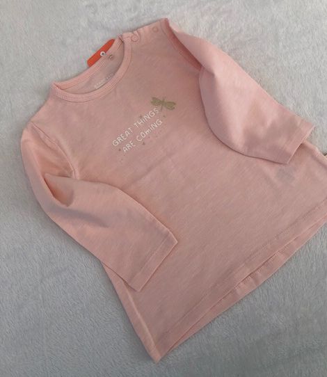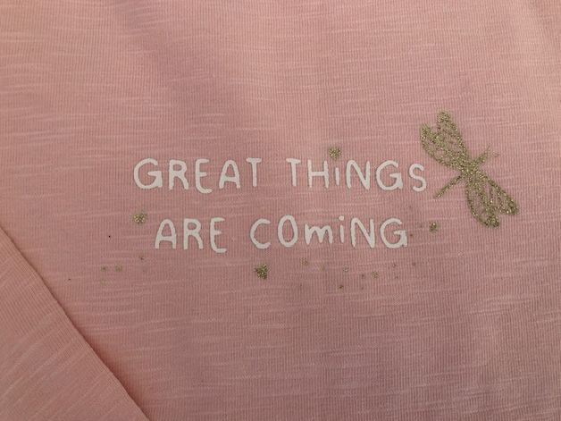 Schattig t-shirt voor meisjes, met de tekst "Great things are coming". Een vlindertje met glitters en een aantal subtiele sprankeltjes maken dit shirt tot een echt meisjesitem. Het achterpand heeft een ronde zoom.. Het shirt heeft twee drukkers op de schouder, wat het omkleden gemakkelijk maakt.